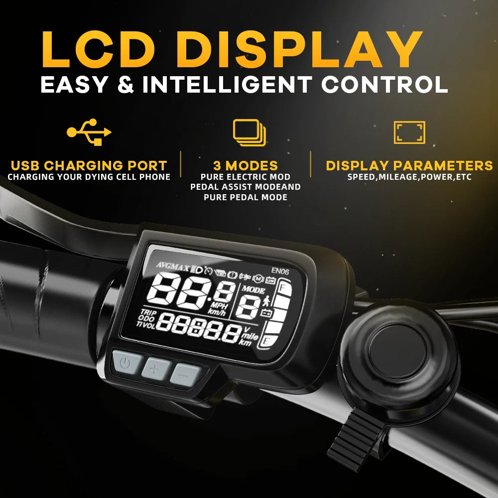 The compact folding frame makes storage and transport effortless—carry it in your trunk, RV, or apartment. A smart LCD display tracks speed, distance, and battery life at a glance.