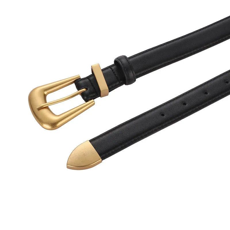 Elegant genuine leather belt in a rich burgundy tone, designed with a classic gold metal buckle. Perfect for pairing with jeans, dresses, or casual outfits, adding a refined touch to any look.