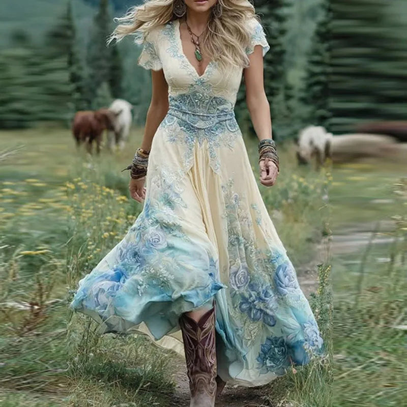 Step into effortless bohemian charm with this ethnic floral patchwork maxi dress. Featuring a deep V-neckline, short sleeves, and an A-line silhouette, it’s designed for comfort and style. Perfect for parties, beach days, holidays, or casual summer outings.