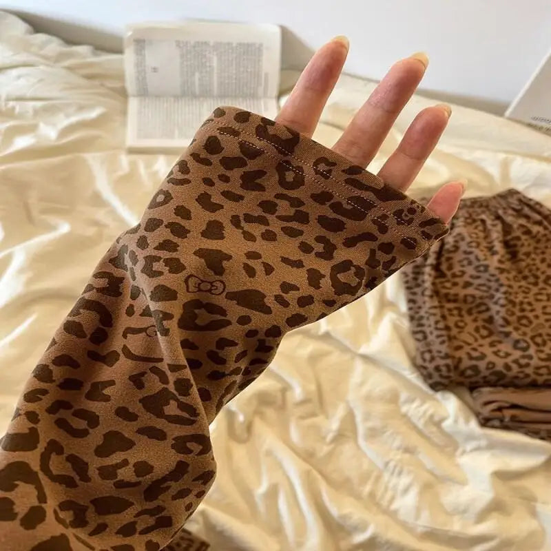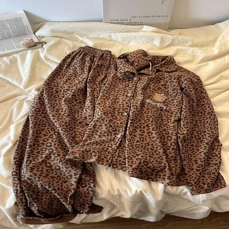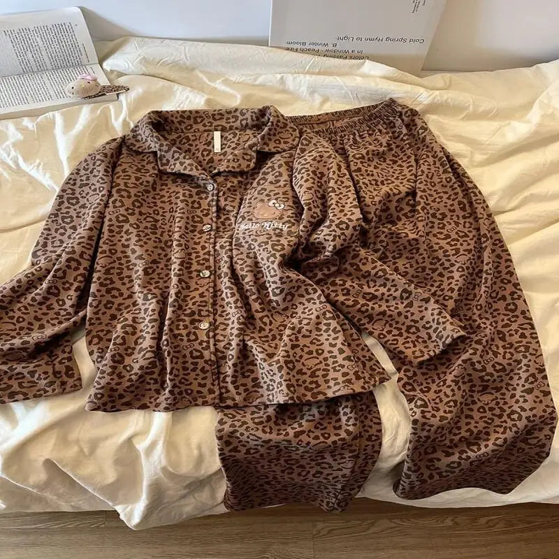 Stay cozy and cute with this playful two-piece sleepwear set, perfect for spring and autumn wear. Featuring an O-neck pullover top and ankle-length pants with a retro leopard print and Hello Kitty appliques, this outfit combines comfort with a fun, Korean-inspired style. The loose-fit silhouette and soft velvet fabric make it ideal for lounging or relaxing at home.
