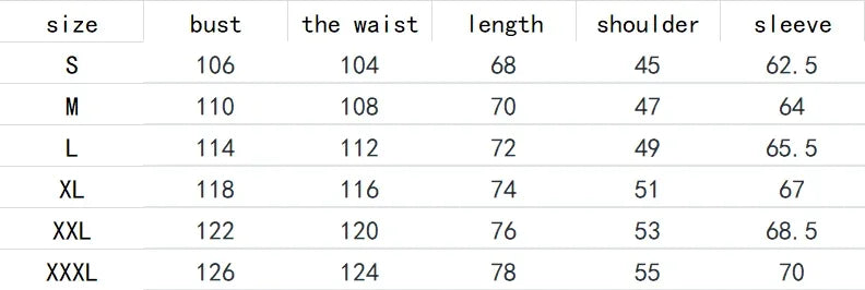 | Size | Bust | Length | Shoulder |