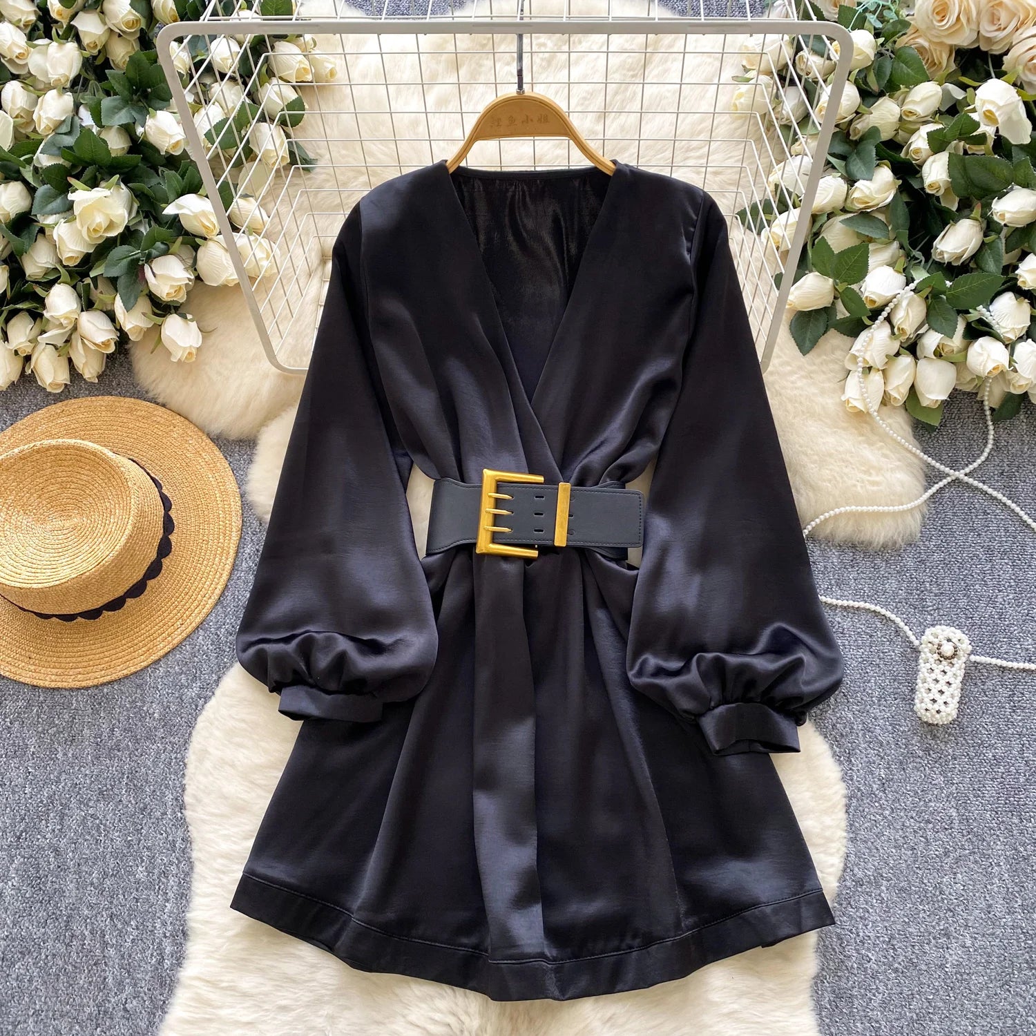 Turn heads with this chic satin mini dress, designed with a flattering V-neckline and elegant ruched long sleeves. Its A-line silhouette and soft satin finish add a touch of fairy-tale charm, making it perfect for autumn parties, dinners, or special occasions. Lightweight with a slight stretch, this dress balances style and comfort for effortless elegance.