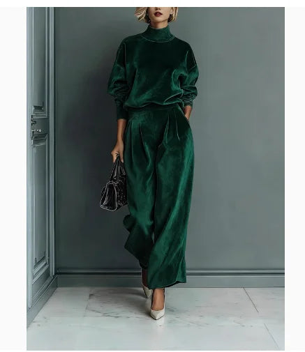 Two-piece set with high-neck long-sleeve top and wide-leg pants