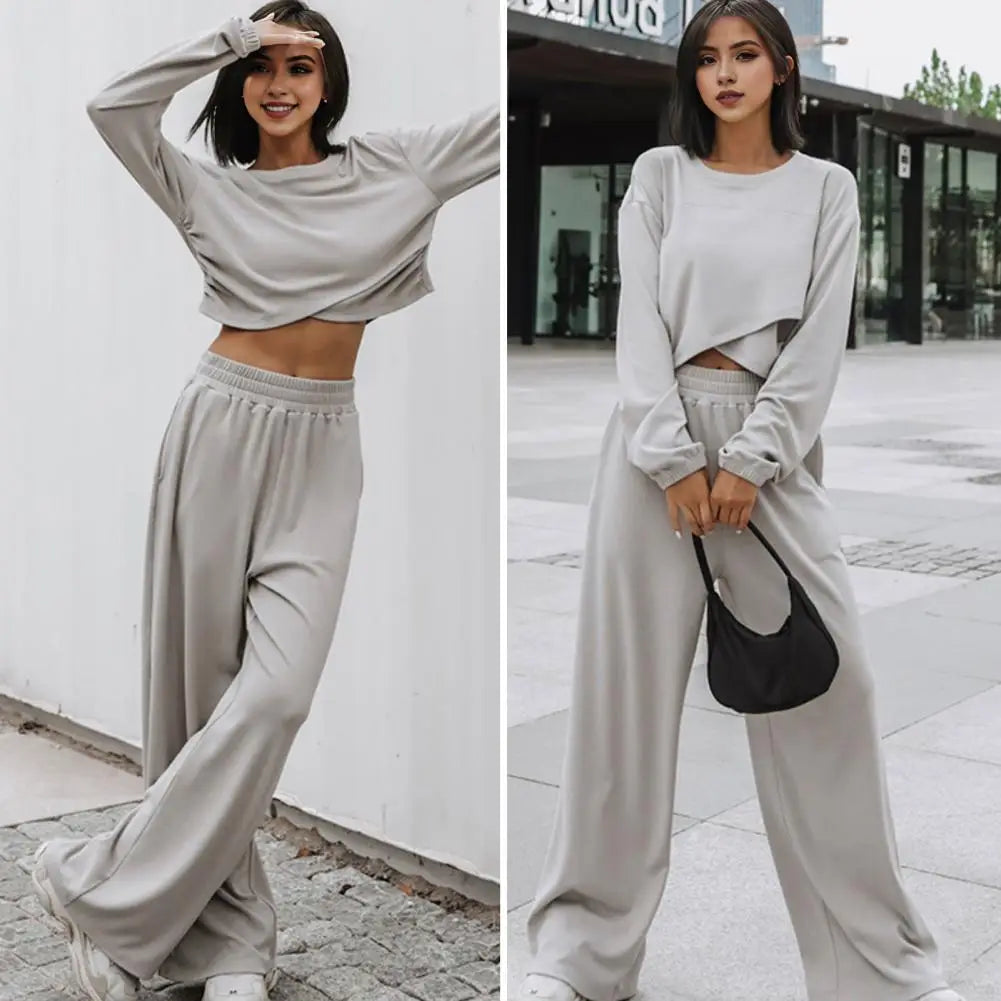 Achieve a chic and comfortable look with this women's two-piece wide-leg set. Featuring a cropped round-neck long-sleeve sweatshirt and high-waist wide-leg trousers with an irregular cross hem, this outfit is perfect for sports, fitness, or casual wear during spring and autumn.